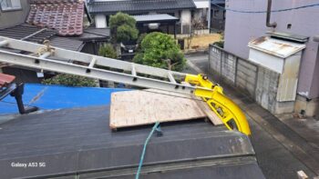 この現場は大屋根に直接ウインチが設置できないため、下屋からの荷揚げ荷下ろし。